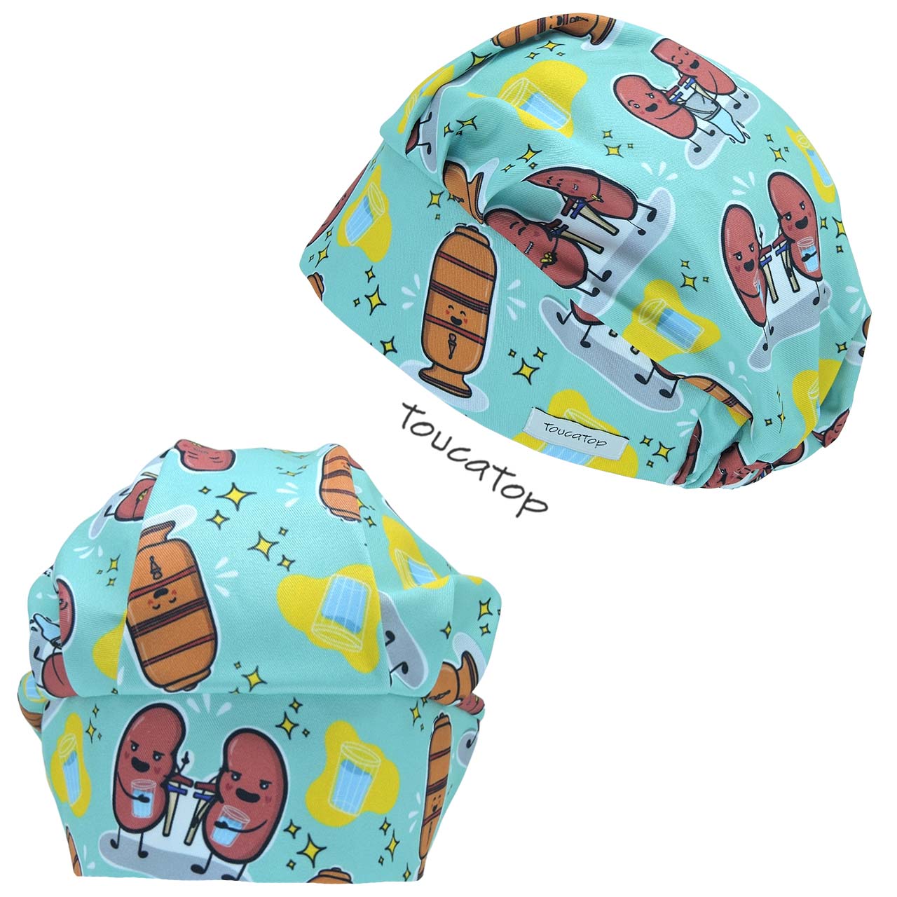 • Touca Cirúrgica Feminina Alice, Desenhos Rins Bebendo Água, Fundo Verde Água.