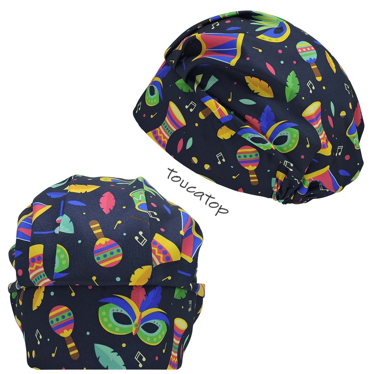 • Touca Cirúrgica Feminina, Chocalhos coloridos, Máscara, Pena, Fundo Azul.