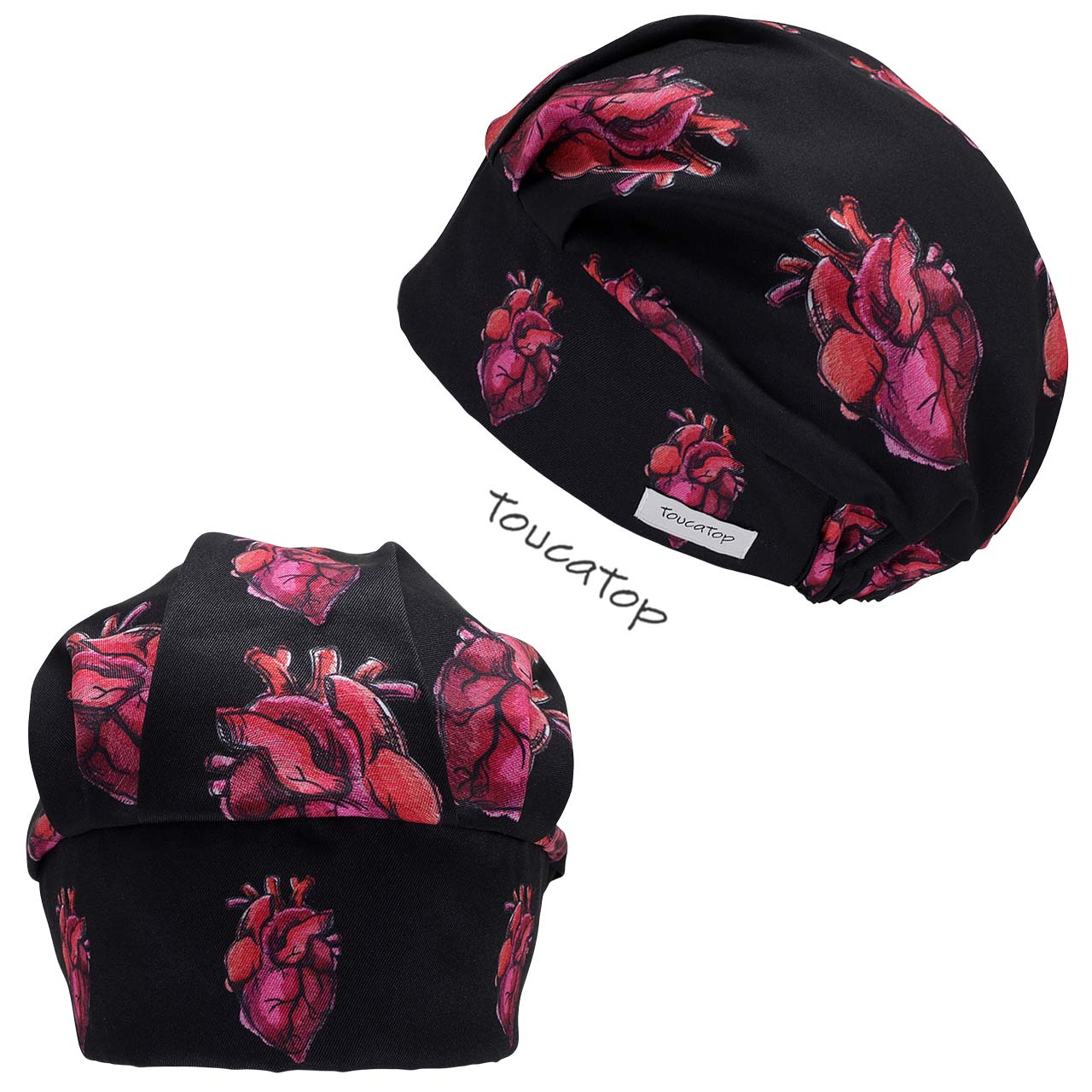 • Touca Cirúrgica Feminina, Corações Vermelhos, Fundo Preto.