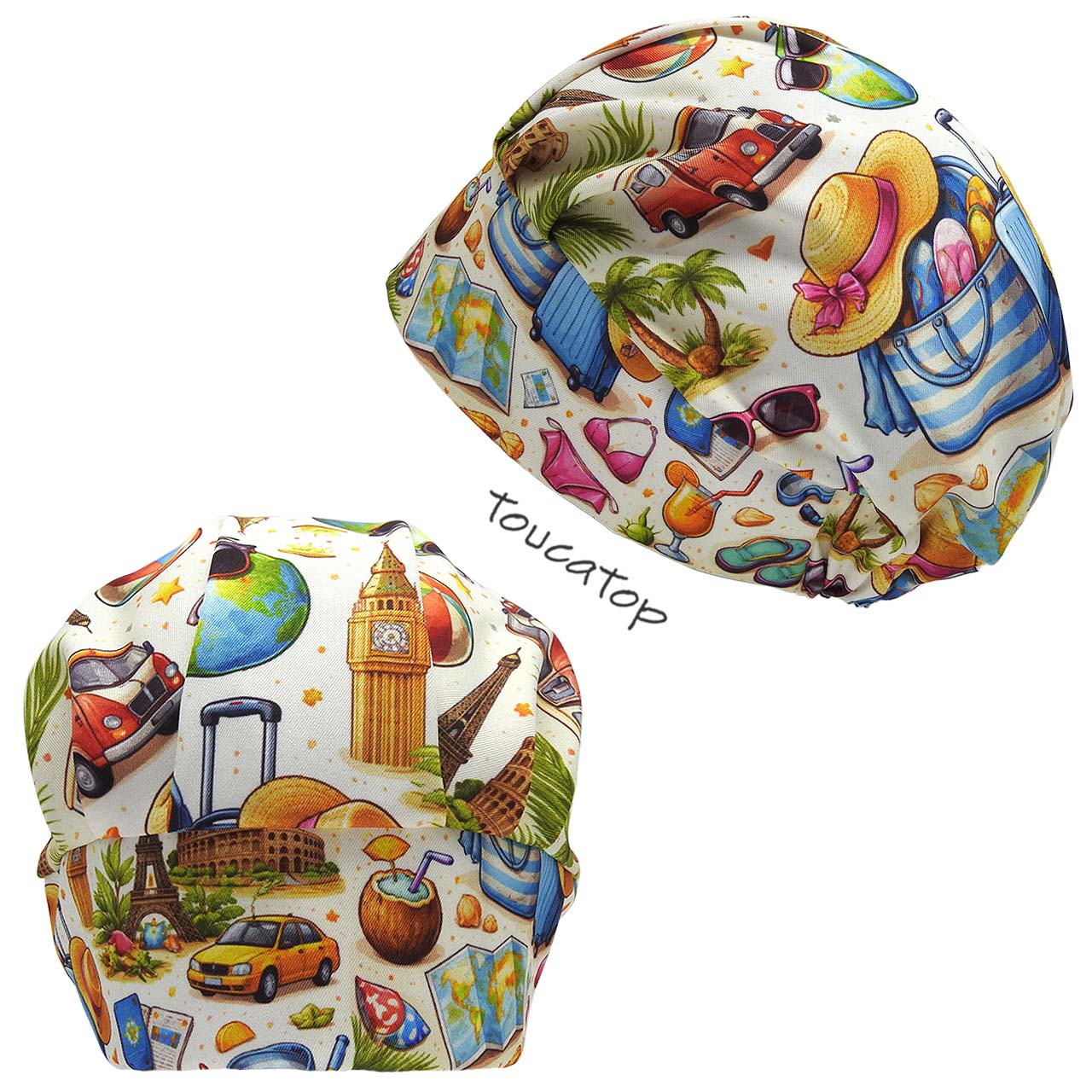 • Touca Cirúrgica Feminina, Viajens pelo Mundo, Chapéu, Carros, Eiffel, Praia, Fundo Creme.