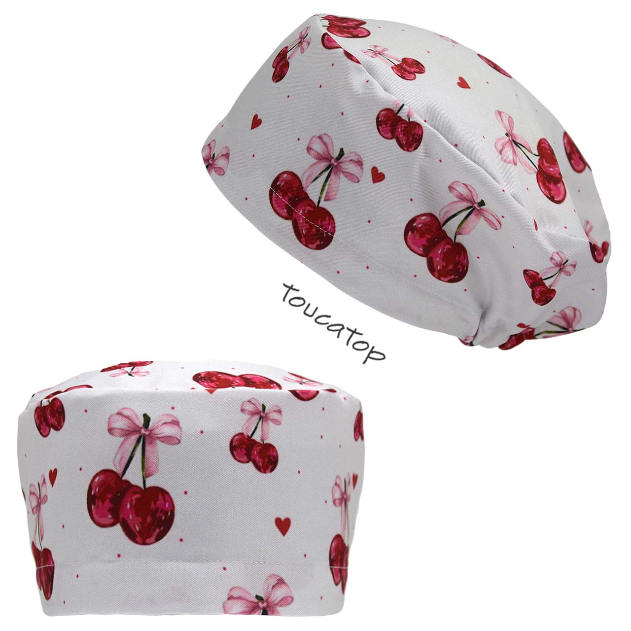 • Touca Feminina ALICE, Cereja com Laço Rosa, Corações pequenos, Fundo Branco.