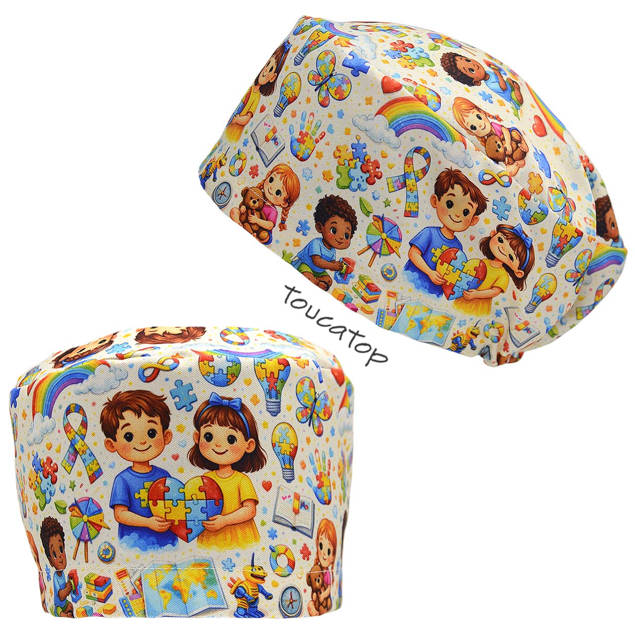 • Touca Feminina ALICE, Crianças Brincando, Autismo,mapa, quebra-cabeça, laço, arco-iris, Fundo Bege.