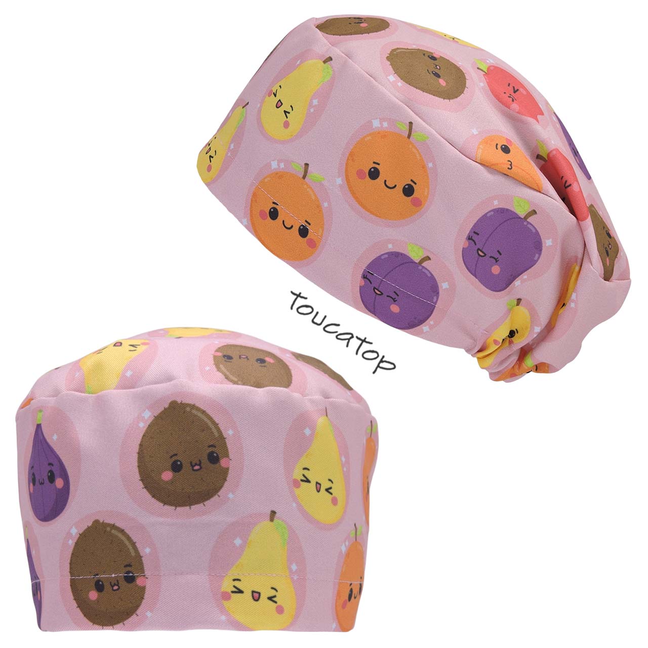 Touca Feminina ALICE, Frutas variadas, coco, pera, laranja, maça, Rosa