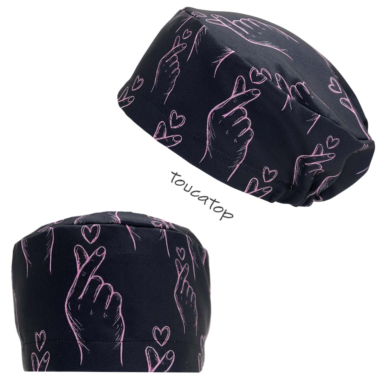 • Touca Feminina ALICE, Mão fazendo Coração Coreano traço rosa, Fundo Preto.