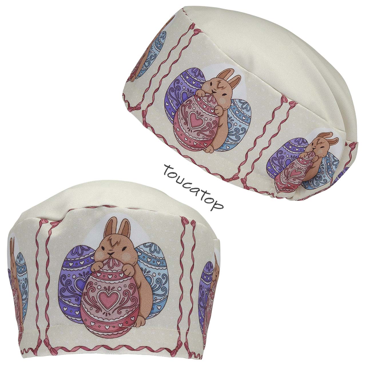 • Touca Feminina ALICE, Páscoa, Barrado Ovos e Coelhos Laço Rosa, Fundo Creme.
