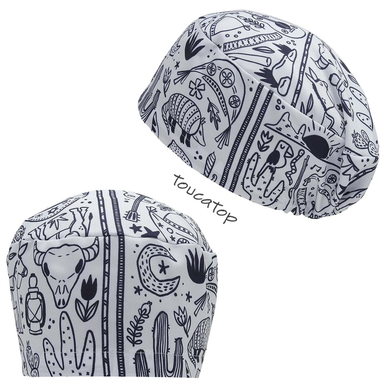 • Touca Feminina ALICE, Símbolos Nordestinos, Crânio de boi, cactos, Fundo Branco.