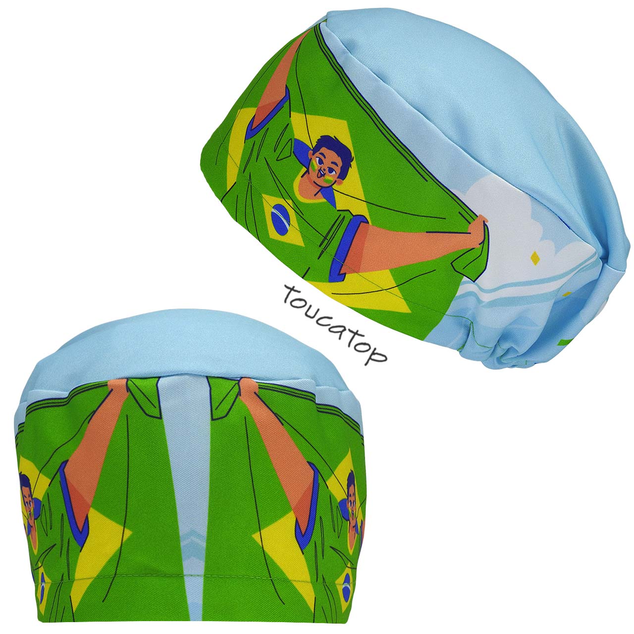 • Touca Feminina ALICE, Torcedor Segurando Bandeira Brasil, Fundo Azul Claro.