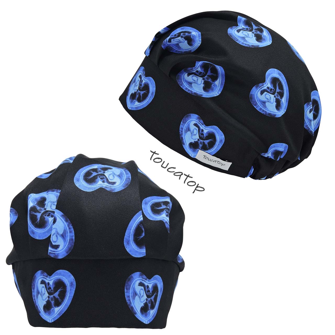 • Touca Cirúrgica Feminina, Bebê no Útero, Ultrassonografia, Tons Azuis, Formato Coração, Fundo Preto.